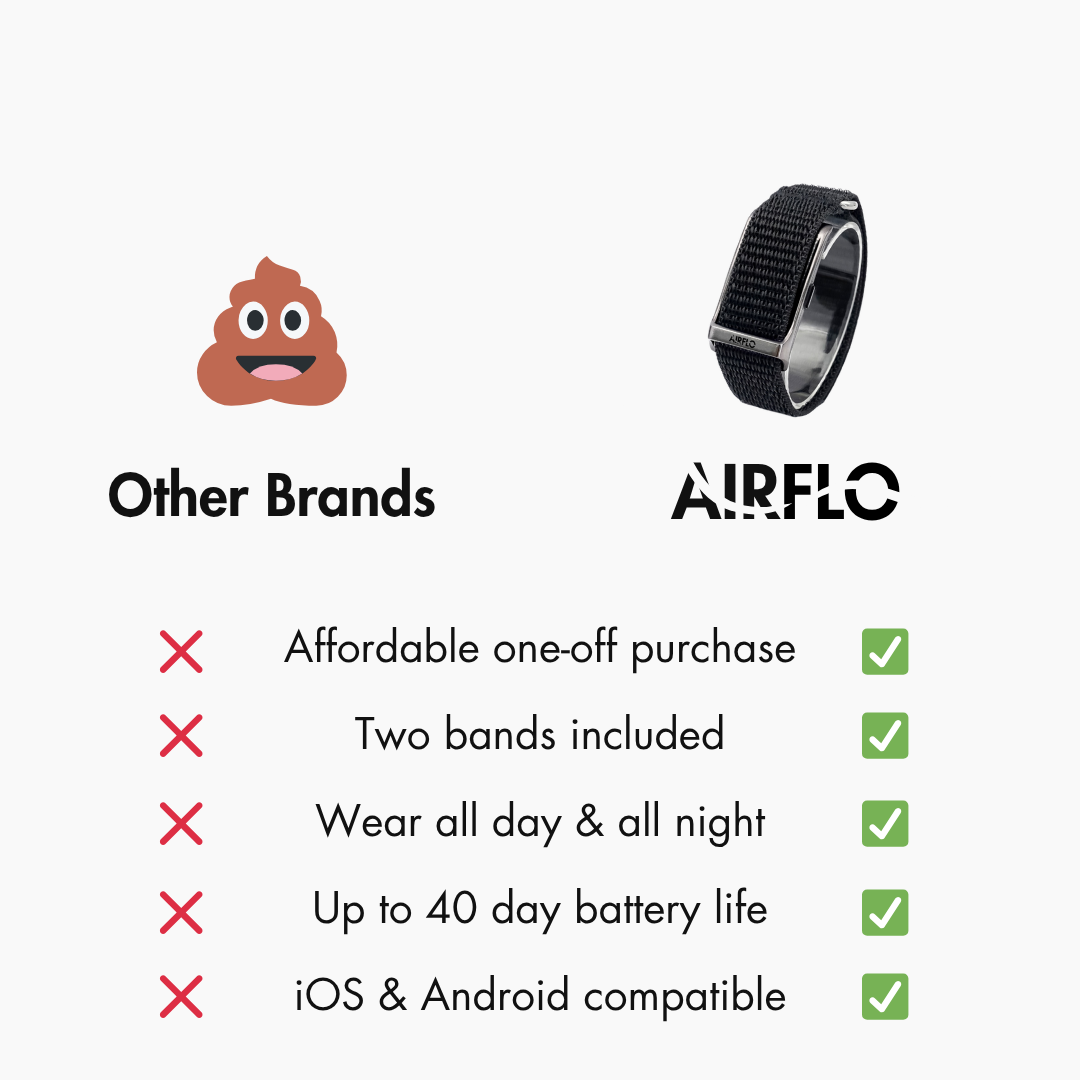 The AirFlo Fitness Tracker is a discreet, all-day health and fitness band designed to help you track your activity, sleep, and overall well-being. It continuously monitors your heart rate, steps, sleep cycles, and more, syncing with the free AirFlo app (iOS & Android) to give you easy-to-read insights about your health.